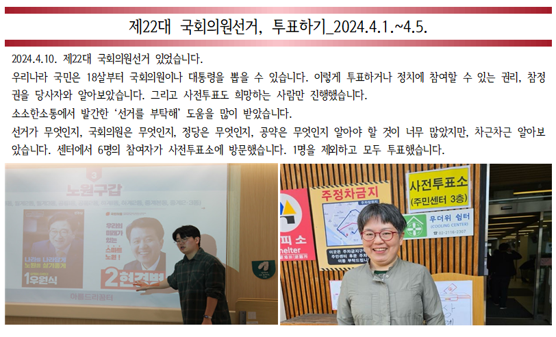 제22대 국회의원선거 투표하기 작성자작성자 박아름 조회조회1,224회 작성일작성일24-04-05 15:40 본문 - 목록목록 이전글서울시장애인권익옹호기관 다학제 컨설팅 24.06.28 다음글집에 늦게 가는 날 24.03.29