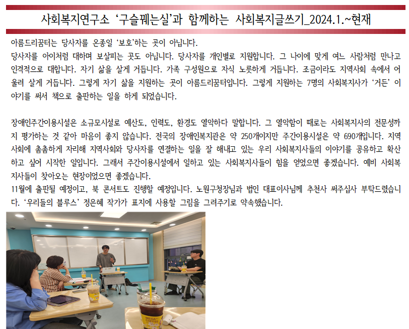사회복지연구소 ‘구슬꿰는실’과 함께하는 사회복지글쓰기 작성자작성자 박아름 조회조회1,334회 작성일작성일24-06-28 15:21 본문 - 목록목록 이전글노원구 눈썰매장 24.02.01 다음글신규 이용인 사람중심회의(PCD:Person Centered Description) 24.01.26