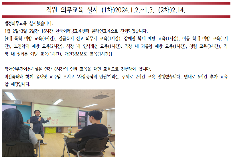 직원 의무교육 실시 작성자작성자 박아름 조회조회1,243회 작성일작성일24-02-15 15:13 본문 - 목록목록 이전글신규 이용인 사람중심회의(PCD:Person Centered Description) 24.01.26 다음글참여약속(2023.4.13.) 23.04.13